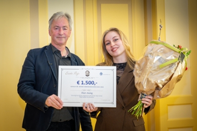 Na de uitreiking van de zogenaamde Eervolle Vermeldingen, was het tijd voor het verlossende woord. De tweede en derde prijs gingen naar Xi Chen en Sergio Oñate Gimeno, die met trots hun faculteiten Wiskunde en Natuurwetenschappen en Archeologie vertegenwoordigden.