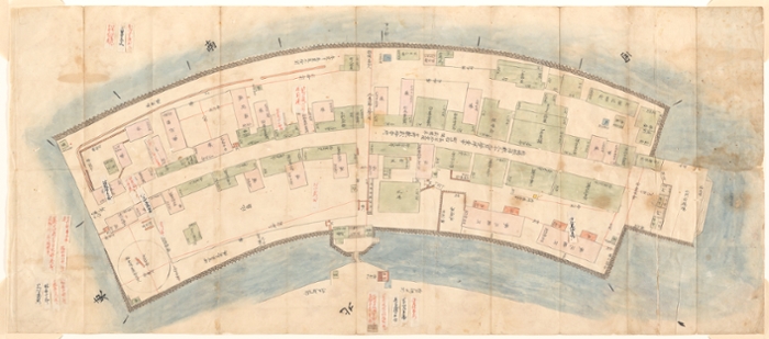 Op de handgetekende plattegrond van 87 bij 38 cm is het waaiervormige eiland zeer gedetailleerd weergegeven. Rond de centrale straat zijn woonhuizen, pakhuizen en waterputten zichtbaar. Daarnaast zijn de aanmeerhaven, een paardenstalling en de enige brug naar het vaste land afgebeeld. De plattegrond is in ongeveer 1720 voor Japanse ambtenaren gemaakt om controle op het Nederlandse eiland en de bewoners te kunnen uitoefenen. Het is een soort kadastrale plattegrond: bij elk gebouw staat aangegeven wie er woonde en hoeveel belasting er moest worden betaald. De plattegrond is voorzien van diverse opgeplakte flapjes met wijzigingen in de namen van personen. Een indicatie dat de plattegrond gedurende langere tijd is aangepast.